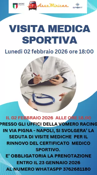 Si comunica che lunedì 02 febbraio 2026 alle ore 18:00 presso gli uffici della Vomero Racing (Via Pigna - Napoli) si terrà la seduta visite medico-sportive per rinnovare il certificato medico, licenza sportiva 2026 e tessera associativa Assominicar.